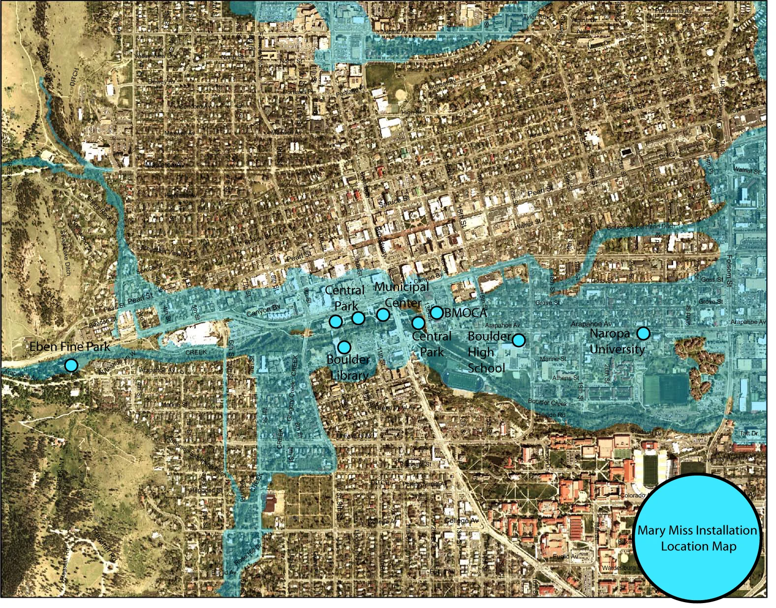 This project is intended to bring attention to the possible flooding of Boulder Creek. It suggests some of the issues to be considered and how this information might be revealed. A fully implemented project would deal with these points and others in detail; it would be an ongoing collection of information involving experts in the field as well as the observations of the residents of Boulder.