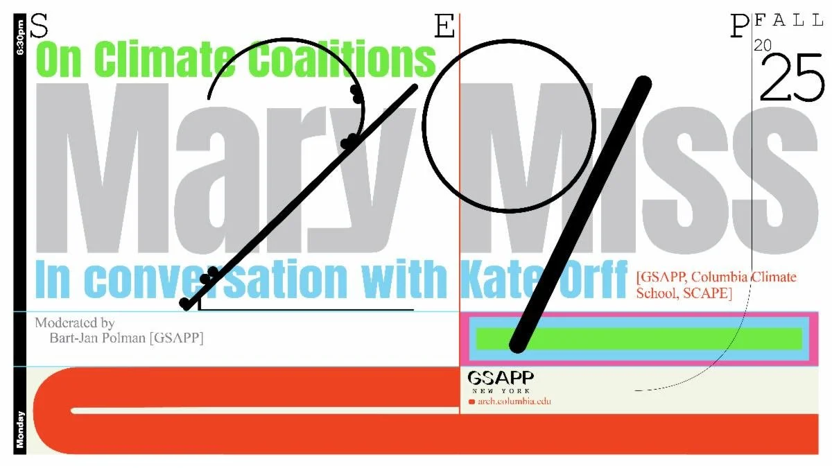 On Monday, September 29th, Mary Miss presented her work at Columbia University's Graduate School of Architecture, Planning, and Preservation. This was followed by a conversation with Kate Orff (GSAPP, SCAPE) moderated by Bart-Jan Polman (GSAPP) at Columbia University's Graduate School of Architecture, Planning, and Preservation.
